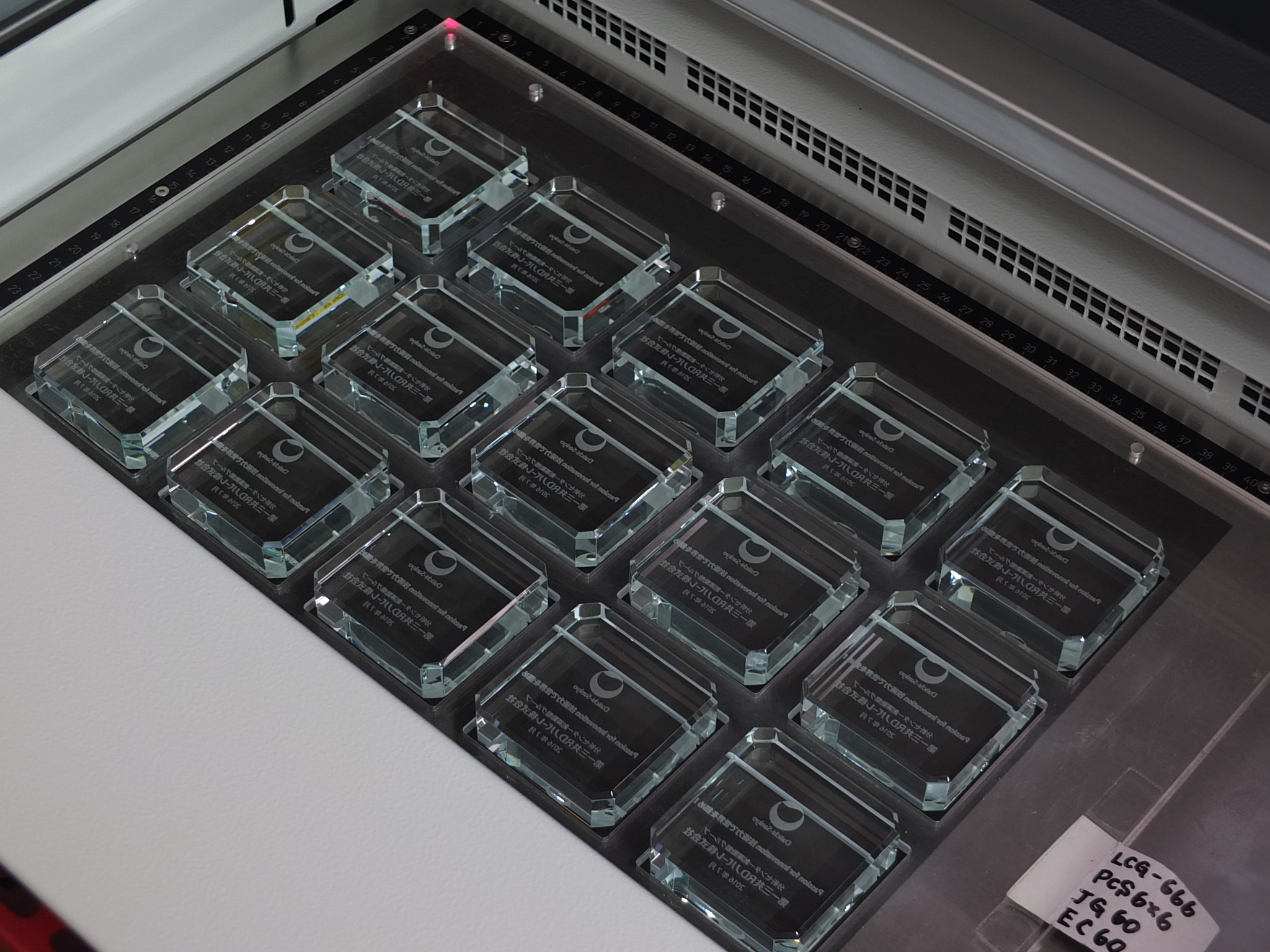 ガラス記念品製品の外面にレーザーを照射し彫刻します。