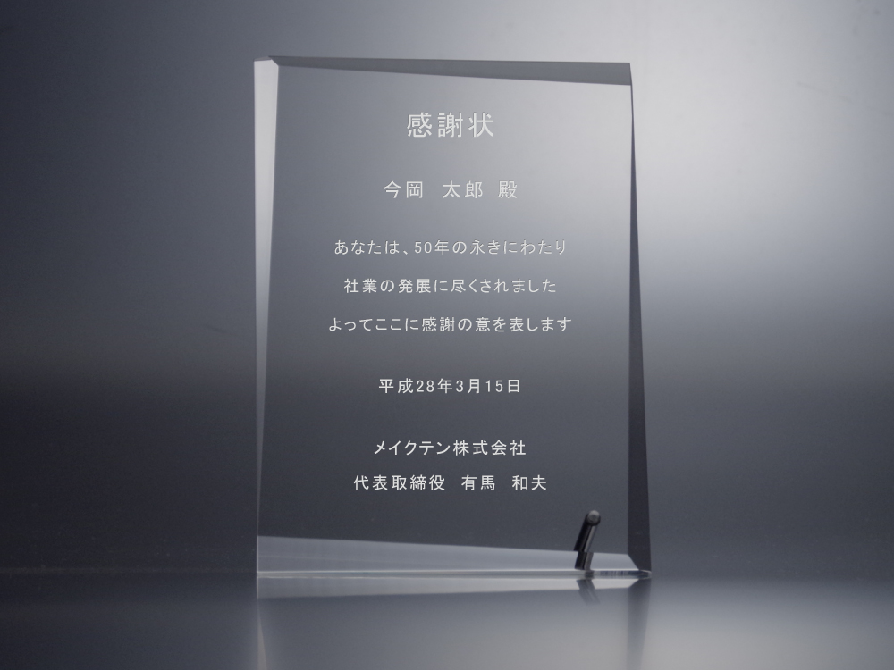 退 職 記 念 ○○○○ 殿 長年にわたる社への貢献に 心より感謝いたします ○○年○○月○○日 ○○○○株式会社 代表取締役 ○○○○ |