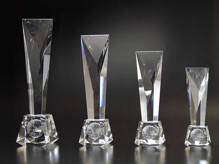 3Dレーザー彫刻した地球儀を台座に入れたグローバルな表彰式にもピッタリなクリスタルトロフィーです。