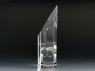 六角柱を斜めにカットしたヘキサゴン・クリスタル・トロフィーの内部に3Dで彫刻した地球儀が入ったトロフィーです。斜めの部分、または下部に名入れが可能です。